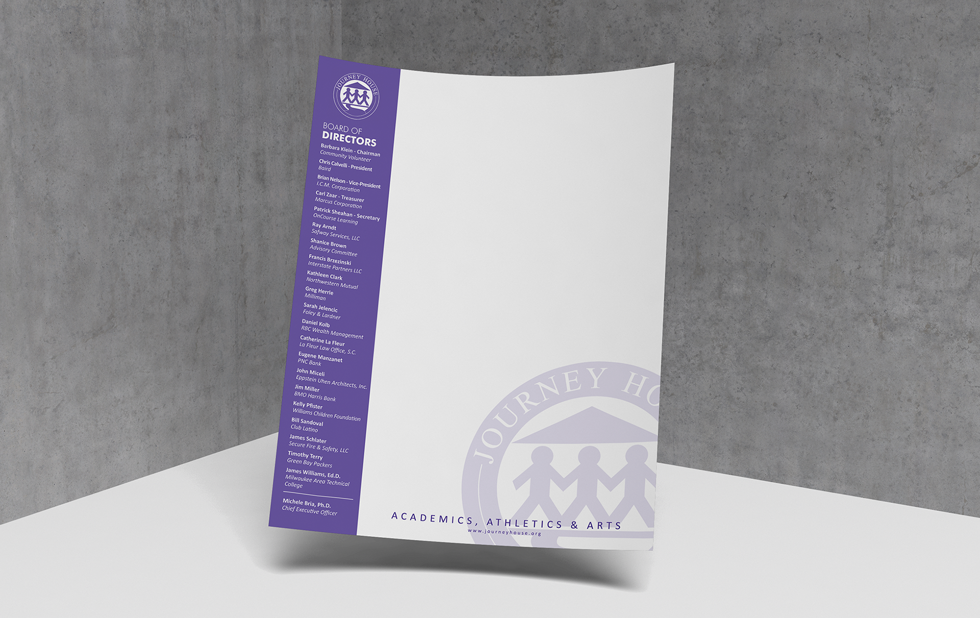 Journey House is a Milwaukee based organization established to empower families to move out of poverty through adult education, youth development, workforce readiness, and family engagement. I was hired to redesign the original organization logo, which subsequently made way to revamp the rest of the visual brand for a more cohesive look for all Journey House materials. The redesign was a process of taking the existing idea of the old logo and enhancing it to further paint the visual picture of what Journey House does for the community. The enclosed circle has a path that leads to home. The people chain inside visually communicates the theme of family and “togetherness”. The simplicity of the elements makes the logo extremely applicable to a wide range of media large and small such as stationary, invitations, reports, billboards, apparel, awards, lapel pins, etc.