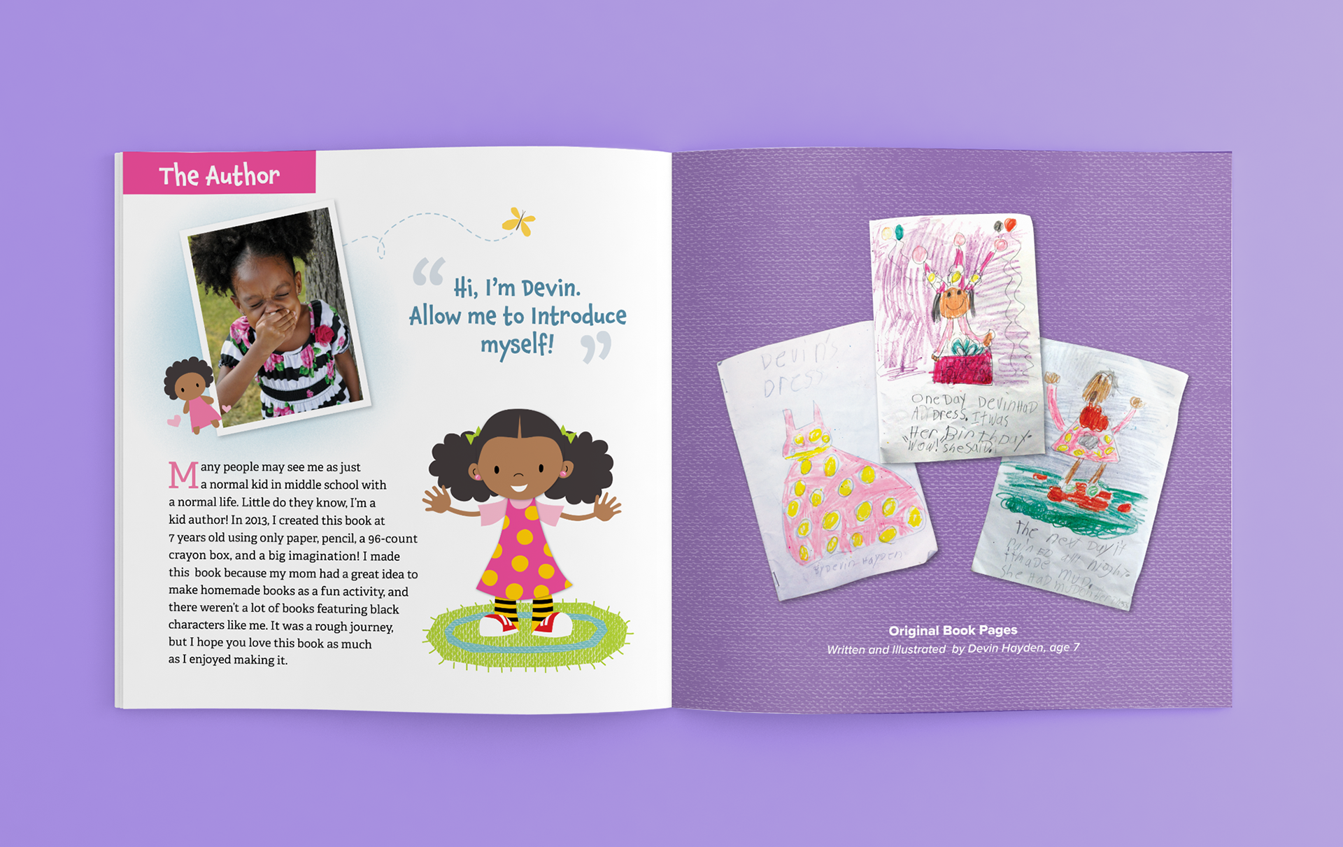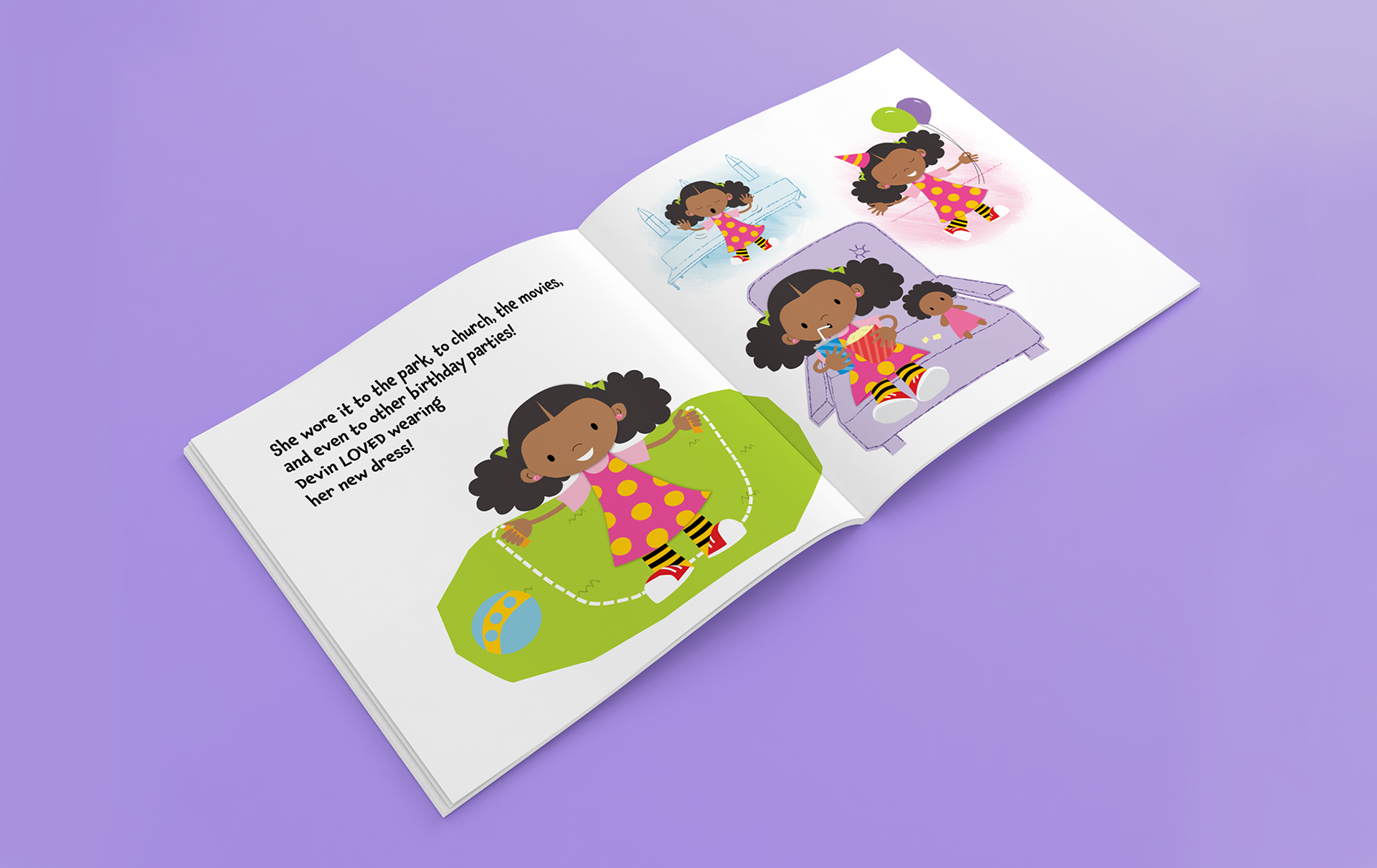 Devin's Dress is a children's book written by kid author, Devin Hayden, under the Lucky Boots imprint. This is Devin's first book and it was written to help little ones learn that accidents happen, and it's okay. Her book also helps lower elementary students improve their literacy, connect parents and children through reading, and increase the positive representation of black girls in books and entertainment. The book was written to have a fun and relatable feel, so I chose to create it visually to match, using simple shapes, vibrant colors, and quirky fonts. In addition, I created the main character in the author's image using the signature qualities like Devin's hair, skin, clothes, colors, and patterns she (and many girls like her) would wear. In recognition of its distinctive design, the book cover for Devin's Dress has received the honor of being selected as one of the ‘Best Book Covers Print Designs of 2024’ by DesignRush, a testament to its compelling visual appeal and the thoughtfulness imbued in its creation.