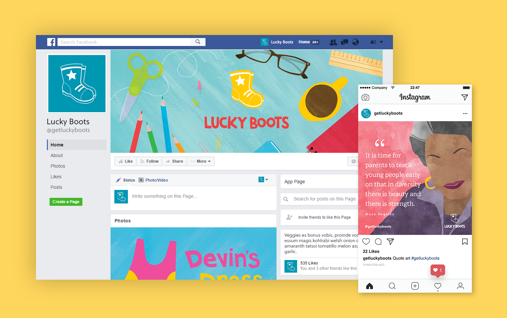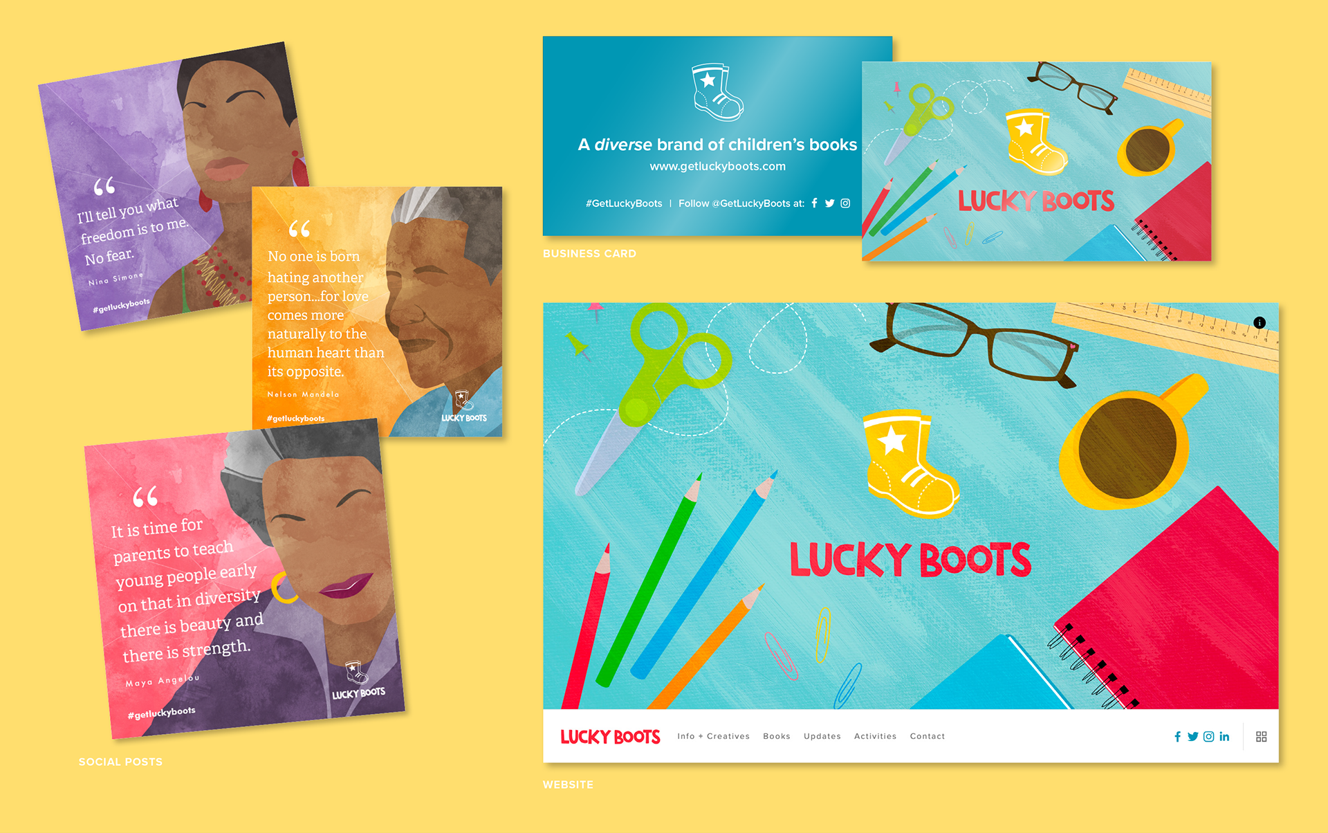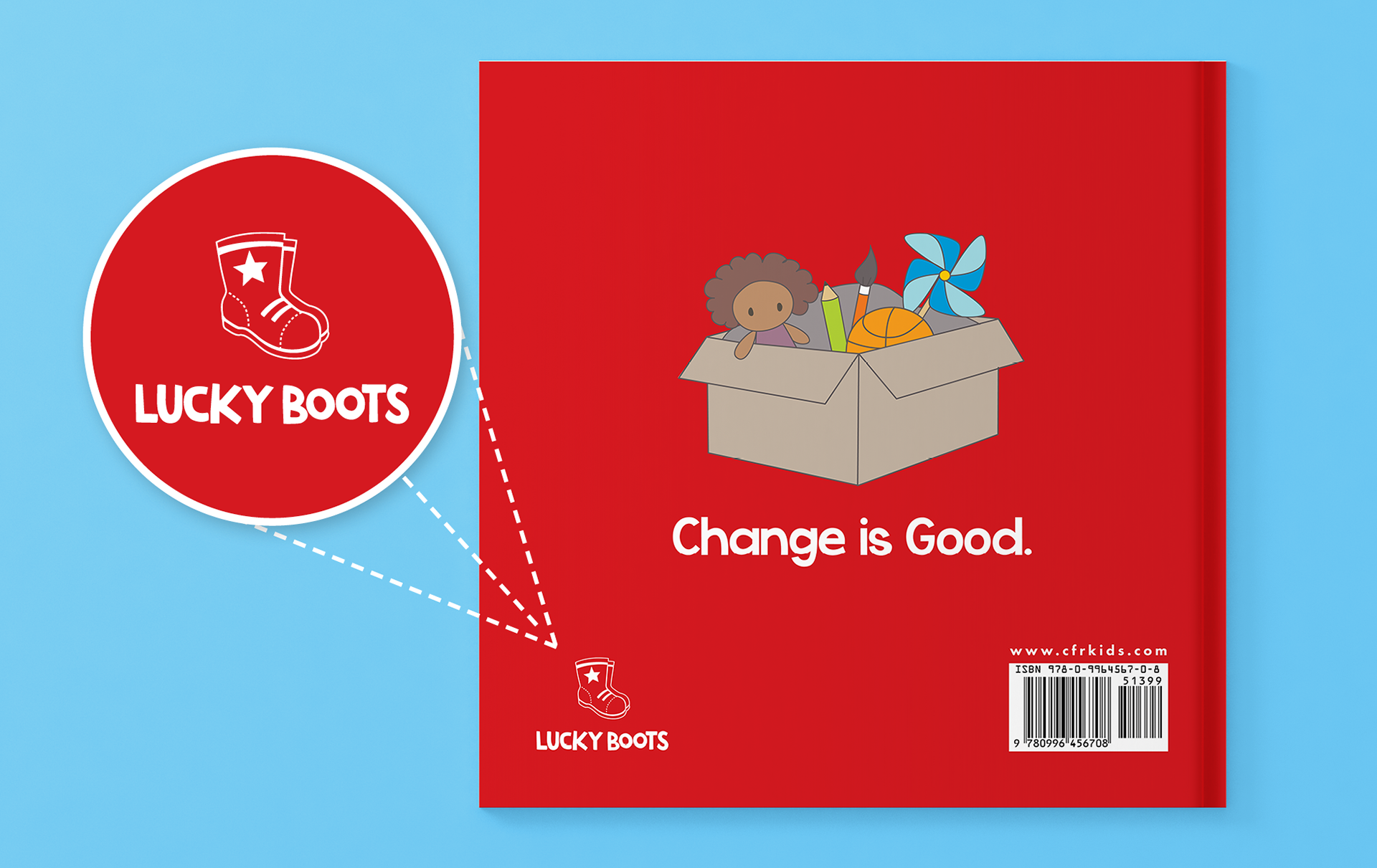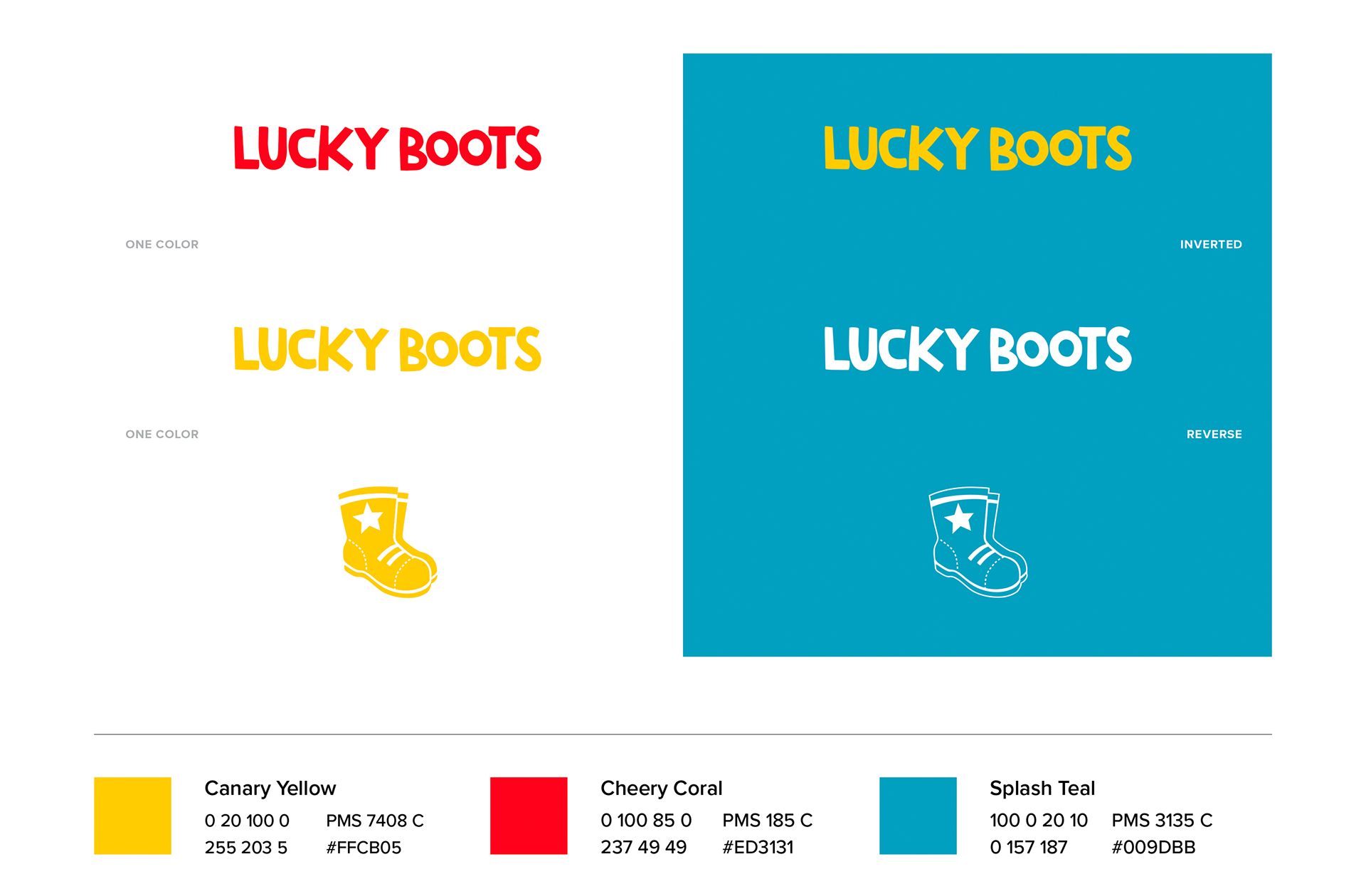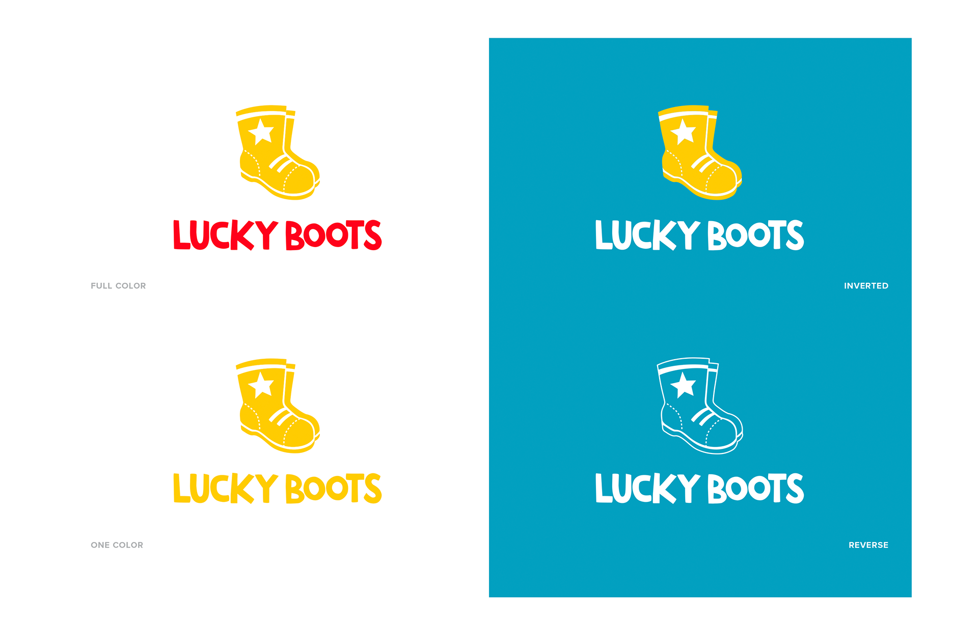 Lucky Boots is a brand of children’s books created to encourage a love of reading and life learning for young readers. The first book published under the brand is 'Moving Day’, book 1 of The Cookie-Flower Rock Kids book series. A series following the lives of 3 young siblings and the quirky adventures they encounter growing up. All aspects of the project, including the identity colors were carefully crafted to reach the target demographic of children and their parents/guardians, aunts, uncles, teachers, mentors, etc. To properly reflect the Lucky Boots brand required a look that celebrated childhood innocence, growth, excitement, adventure and warmth. The youthful boots facing towards the right symbolizes the agenda of helping little ones move forward in their life's journey; the star represents the "special" vibe, very much like the gold star a child earns from a teacher as a reward for a job well done.